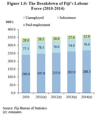 According to the Fiji Bureau of Statistics (FBOS), Fiji’s population in 2014 was estimated at around 865,611 persons. Of this total, 367,154 persons (that is 42.4% of total population) make up Fiji’s labour force, with 344,302 persons working and 22,852 persons unemployed and actively looking for work (Figure 1.0).