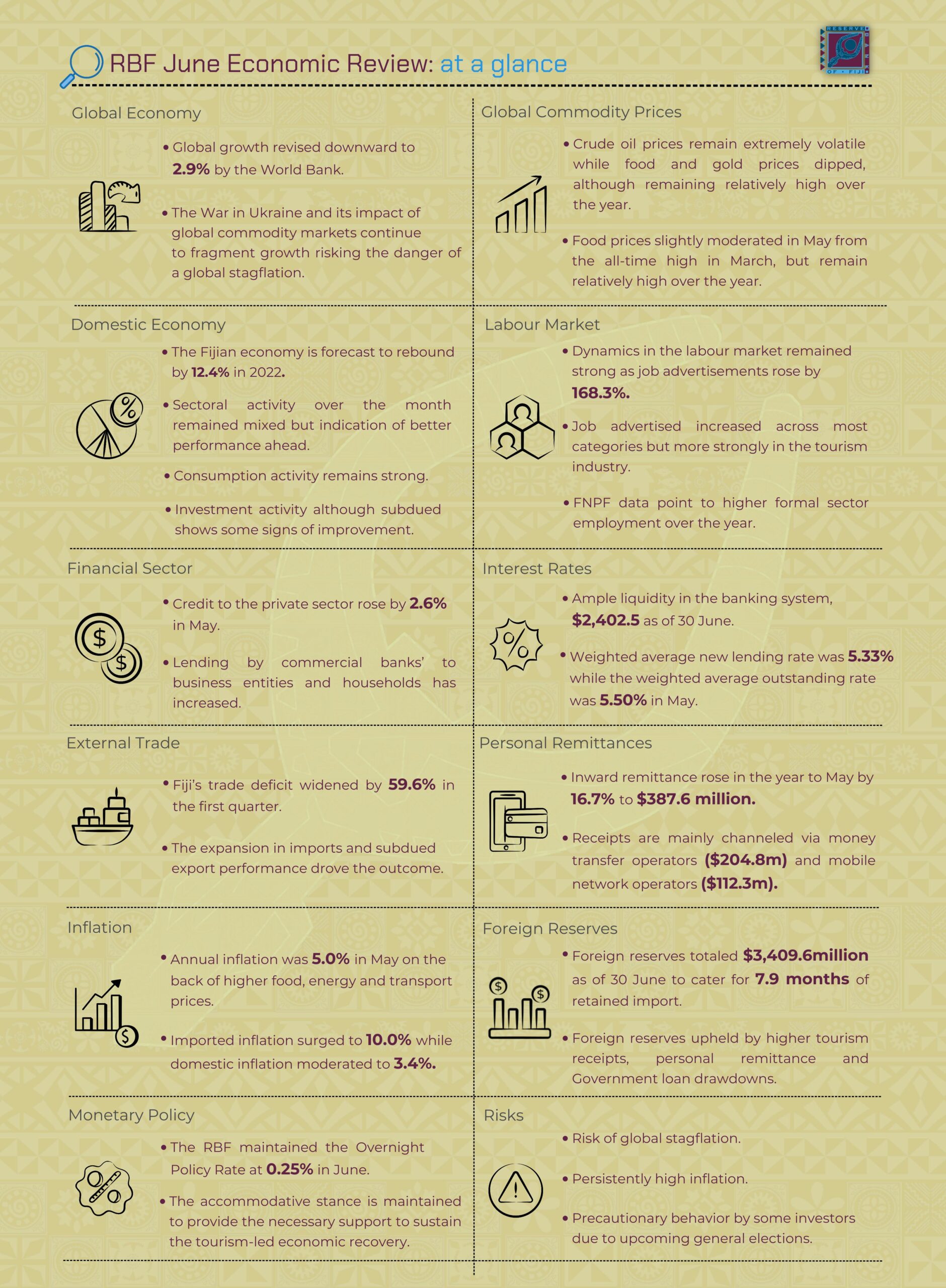 The Reserve Bank is Fiji’s central bank. Our objectives as are to protect the value of currency in the interest of balanced and sustainable economic growth, formulate monetary policy, promote price stability and issue currency.